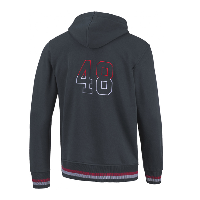 Honda φούτερ SUZUKA 2025. Η συλλογή Suzuka 2025, διαθέτει τσέπη τούνελ, σταθερή κουκούλα ρυθμιζόμενη μέσω δαντέλας, καθώς και εσωτερική επένδυση σε αντίθεση, που θυμίζει το χρώμα που σχετίζεται με το λογότυπο «Honda» και τις δίχρωμες ραβδωτές άκρες. Στο πίσω μέρος εμφανίζεται ο αριθμός "48". Αντιστοιχεί στο έτος δημιουργίας της ιαπωνικής εταιρείας, 1948.