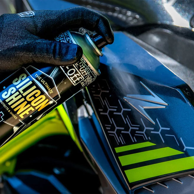Το Silicon Shine όχι μόνο αφήνει τη μηχανή σας λαμπερή σαν καινούρια, αλλά λειτουργεί ακόμα ως εκπληκτικός μειωτής τριβής για τις αναρτήσεις και μειώνει την προσκόλληση βρομιάς. Ψεκάστε το στα πιρούνια και στην πίσω ανάρτηση για να μειώσετε την αντίσταση και τους κραδασμούς.